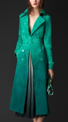 Bright peacock green Dégradé Suede Trench Coat with Patent Trim - Image 1Bright peacock green Dégradé Suede Trench Coat with Patent Trim - Image 2